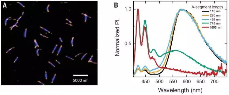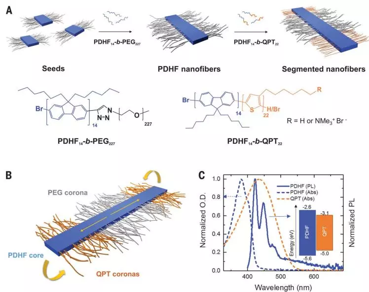 这种嵌段聚合物纳米纤维由PDHF-PEG纳米纤维和PDHF-QPT纳米纤维多步组装而成B-A-B结构。发光的晶态PDHF作为内核,长度可达到10 μm,横截面积为三角形,宽12.9 nm,高4.5 nm。组装后的锯齿状聚乙二醇/聚噻吩包裹在PDHF外层,其中绝缘的聚乙二醇在纳米纤维的中间段,而荧光淬灭的聚噻吩在纳米纤维的两端。
